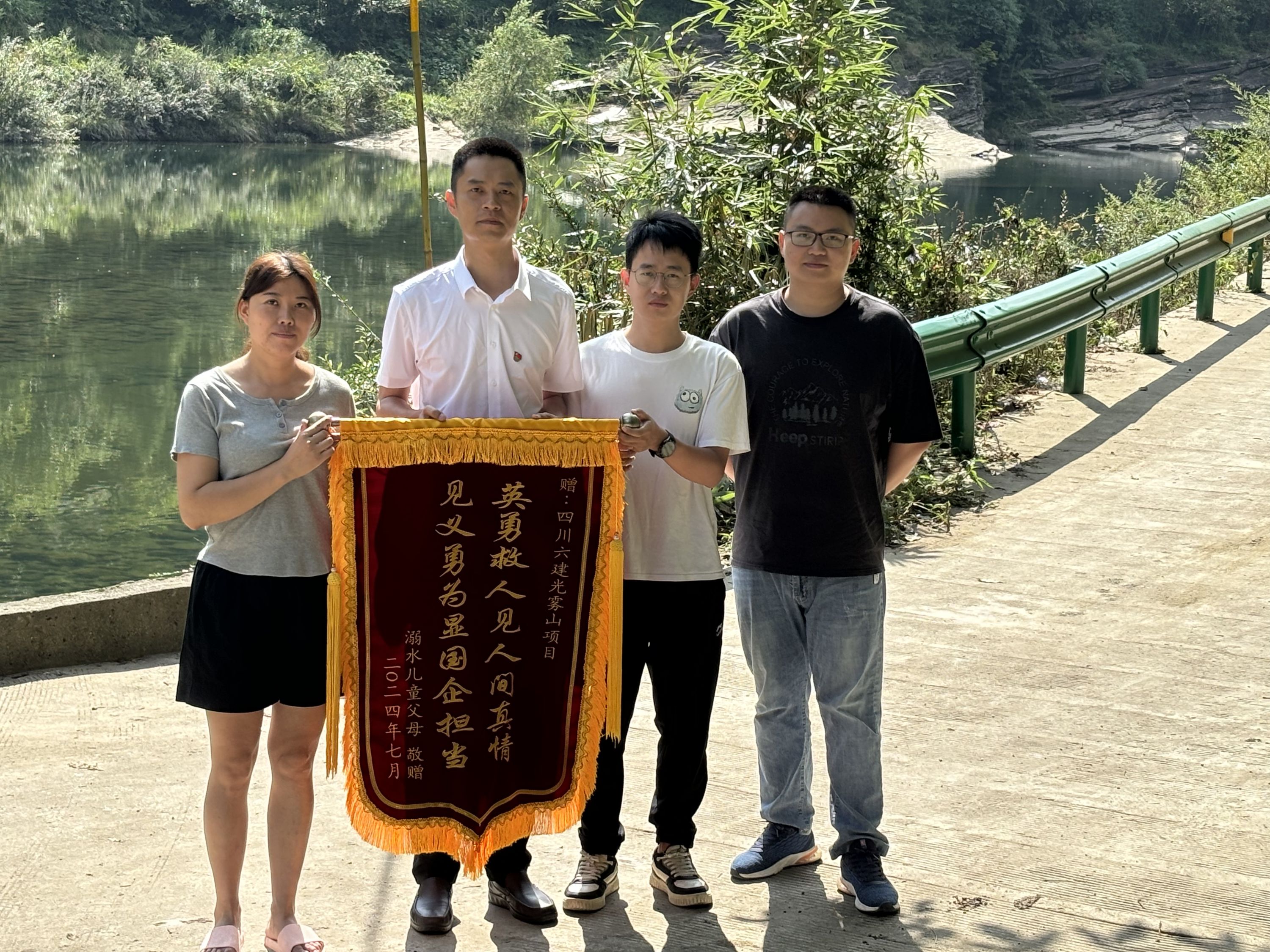 7月28日,位于光霧山旅游景區(qū)基礎(chǔ)設(shè)施建設(shè)項目部附近的光霧山鎮(zhèn)白頭灘村一處漫水橋面一名兒童不慎落水,值此路過的項目管理員王小茜、羅文、唐昆三人見狀挺身而出,合力救起了溺水兒童。幾天后,孩子家長為項目部送來了“英勇救人見人間真情 見義勇為顯國企擔當”錦旗。