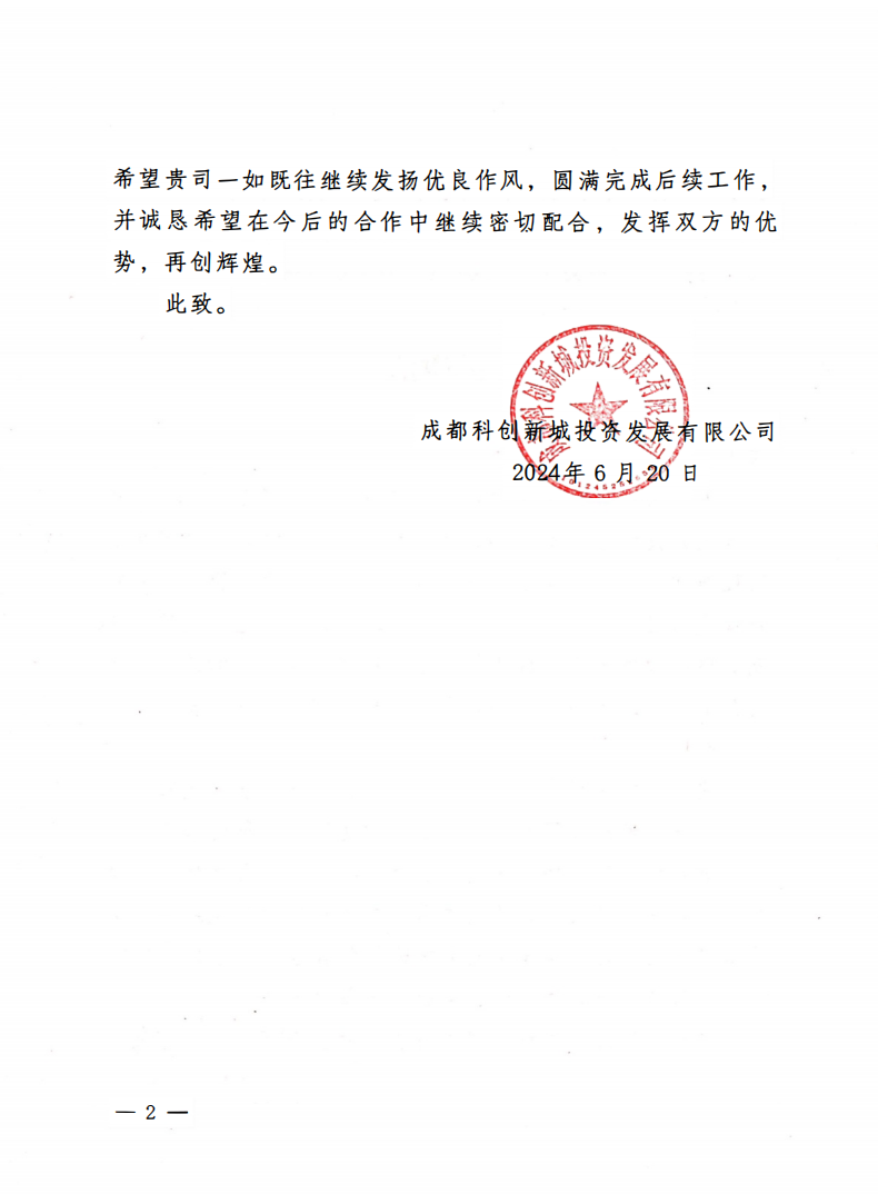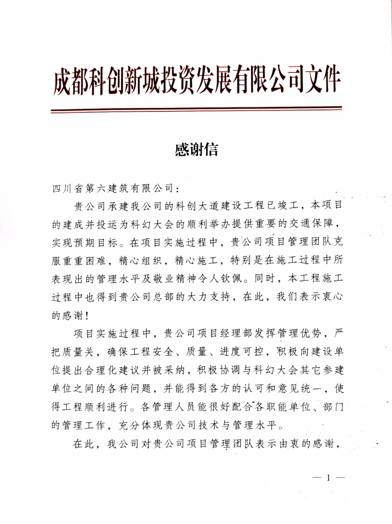 6月20日,公司收到一封來自成都科創(chuàng)新城投資發(fā)展有限公司(下稱:科創(chuàng)新城公司)的感謝信,對公司在科創(chuàng)大道建設(shè)工程項目建設(shè)過程中所付出的努力表達(dá)了感謝和肯定。