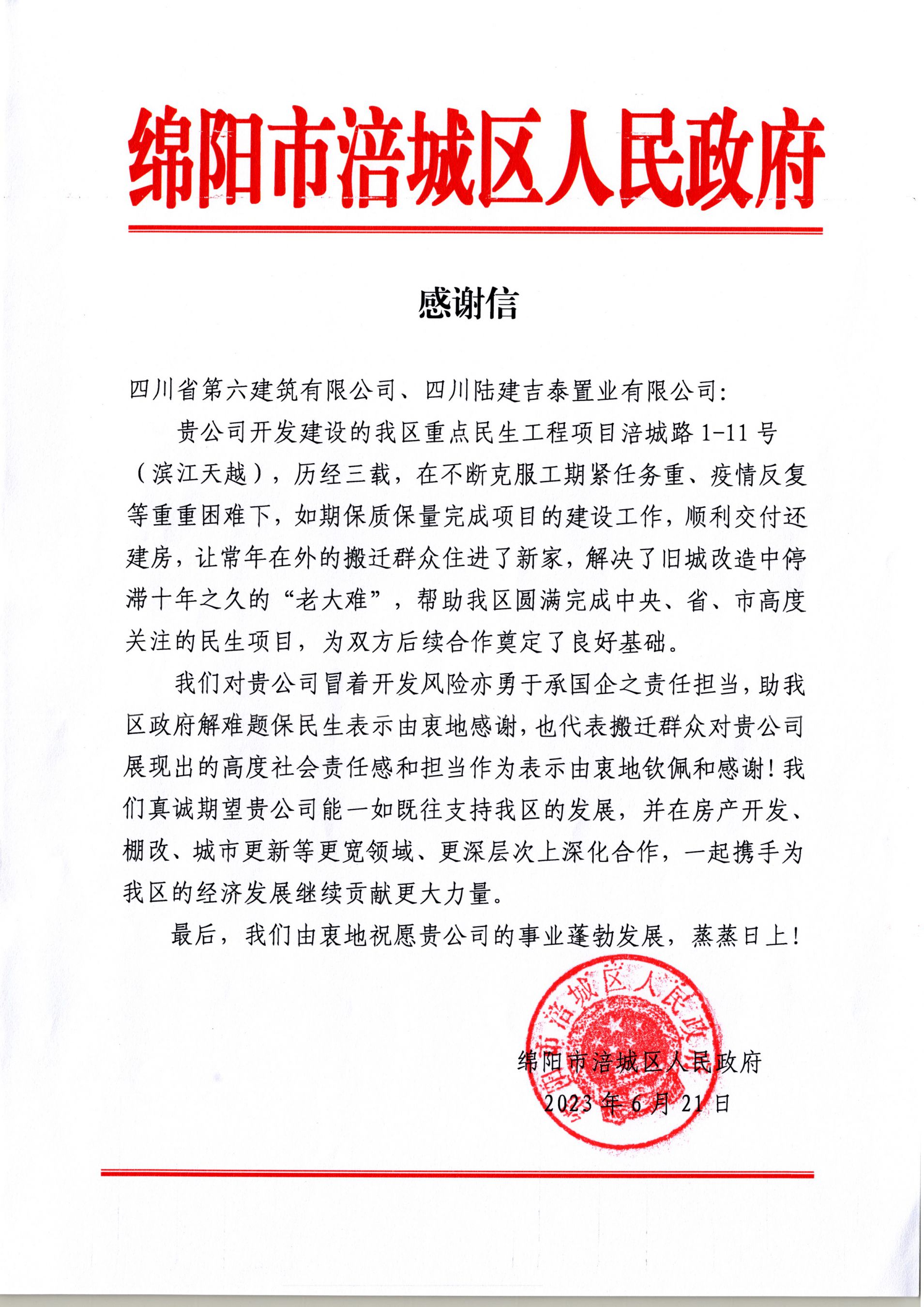 “歷經三載,如期保質保量完成項目建設工作……讓常年在外的搬遷群眾住進了新家,解決了舊城改造中停滯十年之久的‘老大難’,幫助我區(qū)圓滿完成中央、省、市高度關注的民生項目……”6月21日,在一封來自綿陽市涪城區(qū)人民政府的感謝信中,他們如是說道。