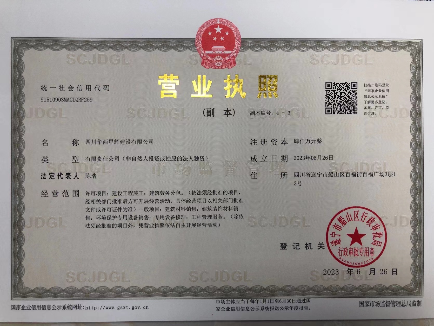 為進一步拓展遂寧及周邊市場、優(yōu)化區(qū)域布局,積極響應(yīng)地方政府關(guān)于規(guī)范屬地化管理的要求,統(tǒng)籌管理公司在遂項目。6月26日,在集團的關(guān)心和大力支持下,四川六建在遂全資子公司——四川華西星輝建設(shè)有限公司順利完成工商注冊。
