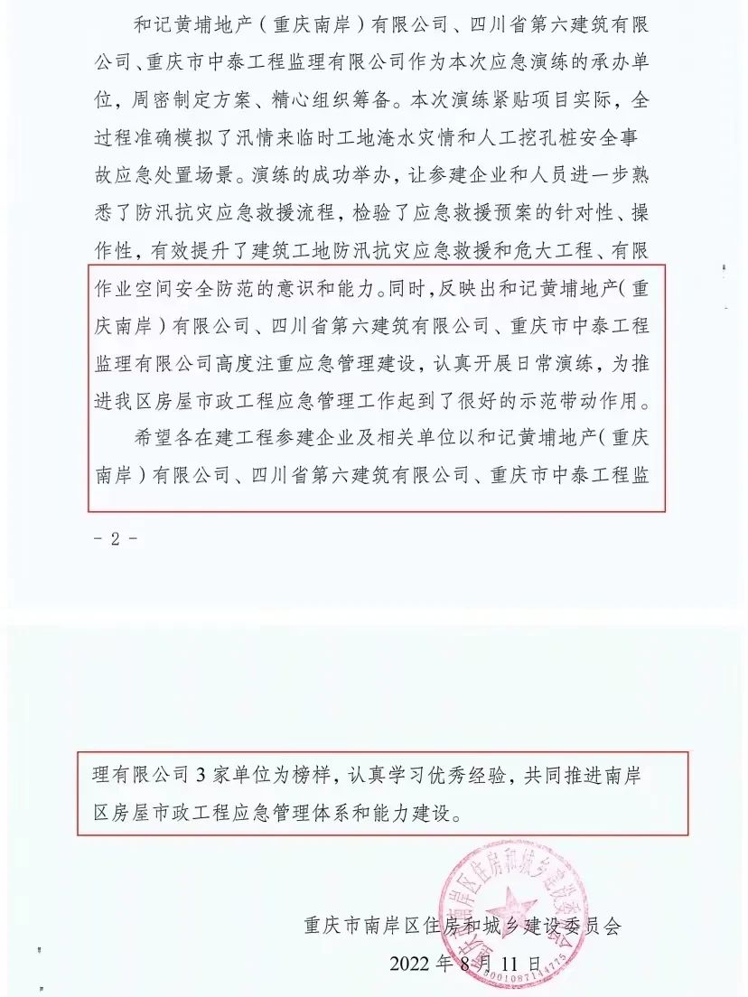近日,重慶市南岸區(qū)住建委下發(fā)文件,對和黃楊家山4號地塊項(xiàng)目承辦的“防汛暨危大工程”應(yīng)急演練取得的成效給予極大肯定,對四川六建的應(yīng)急管理水平和起到的良好示范帶頭作用進(jìn)行通報(bào)表揚(yáng)。