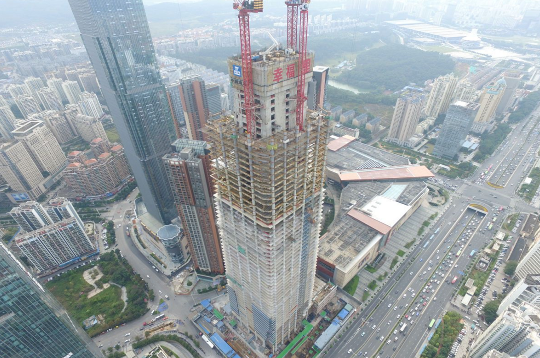 此外,由中建三局施工的成都綠地468項目總建筑面積45.6萬平米,其中T1塔樓建筑高度468米。T1塔樓地上每層共設16根外框巨柱,巨柱在建筑每層按照向內和向外交錯傾斜進行布置,且巨柱截面隨樓層升高逐漸減小,直徑變化范圍從2800毫米到1200毫米,巨柱最大傾斜角度為內7°、外4°。施工單位在經(jīng)過長時間的及模擬后仍無法解決施工難點,最終選擇采用“華西—DOKA智能爬模系統(tǒng)”,目前該工程已順利施工至82.25米。