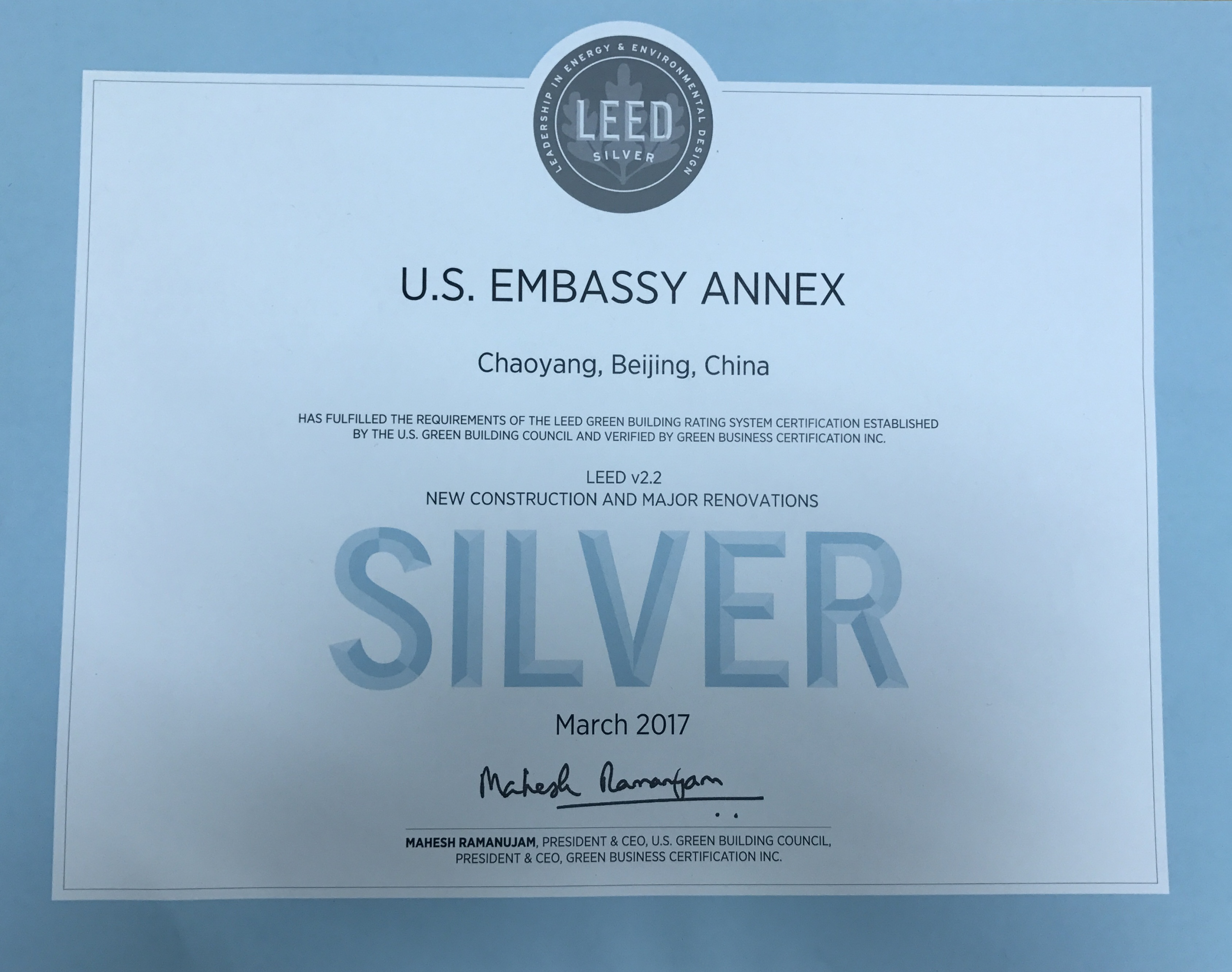 近日,由廣州分公司承建的北京大使館新建辦公樓項目獲得美國綠色建筑節(jié)能環(huán)保先鋒LEED銀獎,再次為集團及公司贏得一項國際榮譽。