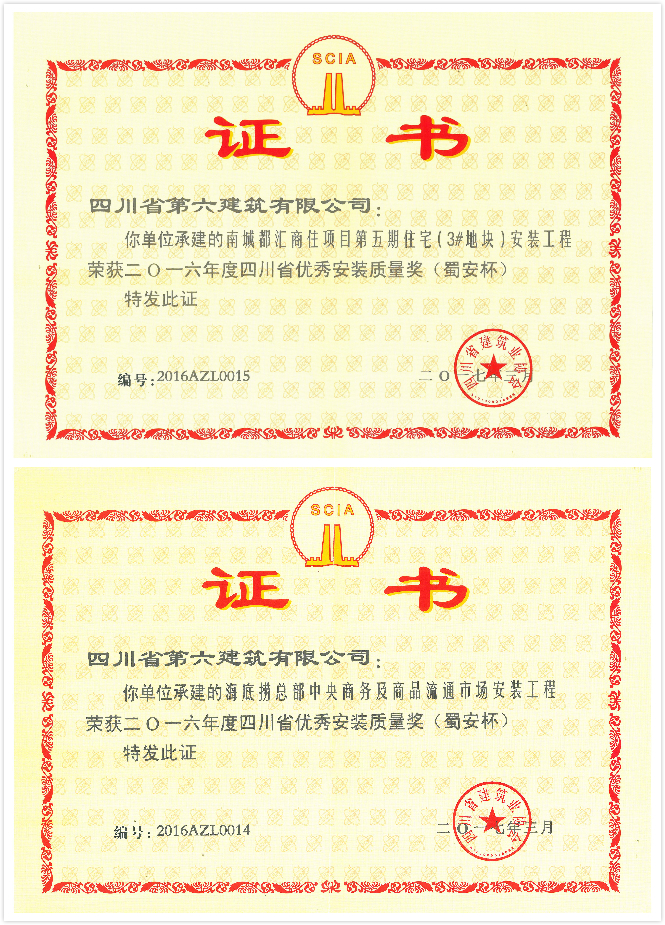 近日,由公司承建的南城都匯商住項(xiàng)目第五期住宅(地塊3#)安裝工程及海底撈總部中央商務(wù)及商品流通市場(chǎng)項(xiàng)目安裝工程,經(jīng)主管部門(mén)初評(píng)、復(fù)查、評(píng)審、公示后,分別榮獲2016年度四川省優(yōu)秀安裝質(zhì)量獎(jiǎng)。