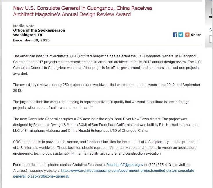 按語:美國駐廣州總領(lǐng)事館項目由四川省第六建筑有限公司廣州公司承建,于2009年9月20日開工,2013年7月15日完工。2013年11月,該項目獲得美國國務(wù)院海外建設(shè)局年度最佳項目稱號;同年底,該項目被美國建筑師協(xié)會(AIA)評為17個年度優(yōu)秀工程之一。本文是編譯的美國國務(wù)院新聞公報,該公報提及“來自中國成都的中國華西企業(yè)股份有限公司”為該項目總承包商之一,是對參與該項目上千名華西員工付出的智慧和汗水的高度認可。下面是新聞公報內(nèi)容的翻譯文件。