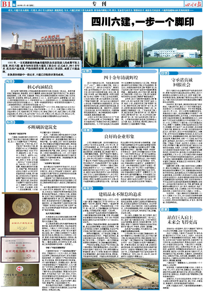 1965年,一支充滿激情和熱血的建筑隊伍在富饒迷人的成都平原上結(jié)集,四川六建(前身為四川省第六建筑工程公司)正式成立。四十多年間,優(yōu)良的產(chǎn)品質(zhì)量、嚴(yán)格的現(xiàn)代管理、優(yōu)秀的工作團隊,成就了六建品牌。