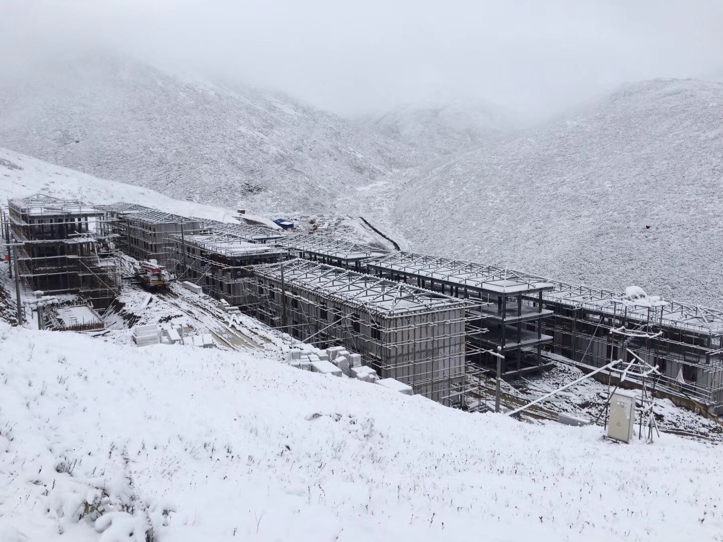 自10月初以來,位于海拔4100米的色達喇榮寺五明佛學(xué)院勸退覺姆兩個安置點建設(shè)工程點里迎來了2017年的第一場大雪,正是這一場“大雪”,給項目工作的推進帶來了不小的困擾。由于這一場提前到來的大雪,導(dǎo)致進入施工現(xiàn)場的主干道險情不斷,施工材料無法按時到達施工現(xiàn)場,給現(xiàn)場的施工提出了不小的挑戰(zhàn)!此刻,程剛和孫一文一邊嚼著方便面,一邊望著窗外的大雪,心里不禁又犯起了一陣嘀咕?!靶〔?,明天一早先安排一臺裝載機把道路先修一下哈,明天有材料要到,這個節(jié)骨眼上千萬不能出閃失!”程剛一邊“嚼”著方便面,一邊在電話里說道。透過窗,看著燈火通明的施工現(xiàn)場,程剛和孫一文兩人心里說不出的一番滋味。“團結(jié)大道”、“東環(huán)線”、“和諧路”......,太多太多的痕跡見證了這里的變化,雖然兩人嘴上不說,但是心里卻都明白。